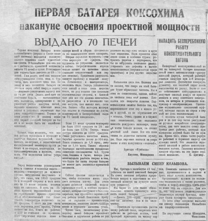 Уже 23 января 1935 года вторая батарея нового завода начала выдавать кокс, и суточный выжиг кокса достиг 2500 тонн, выработка бензола — 20 тонн, значительно возросло производство сульфата и переработка смолы. В сентябре 1935 года в цехах завода развернулось