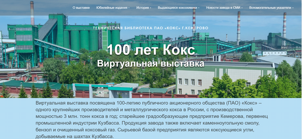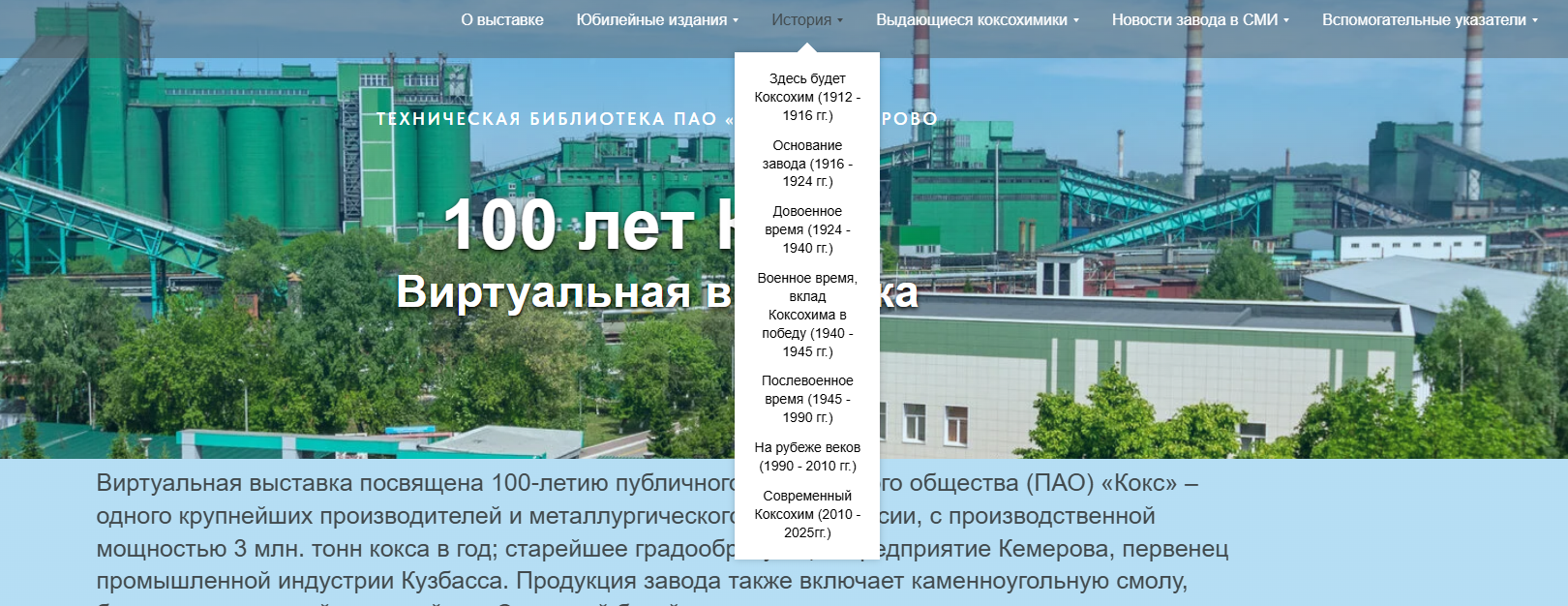 С главной страницы можно ознакомиться с рубриками «О выставке», «Юбилейные издания», «История», «Выдающиеся коксохимики», «Новости завода в СМИ», «Вспомогательные указатели», «Вспомогательные указатели», «Руководство пользователя». Каждая страница виртуальной выставки сопровождается кнопками навигации, расположенном в нижней части рабочей области