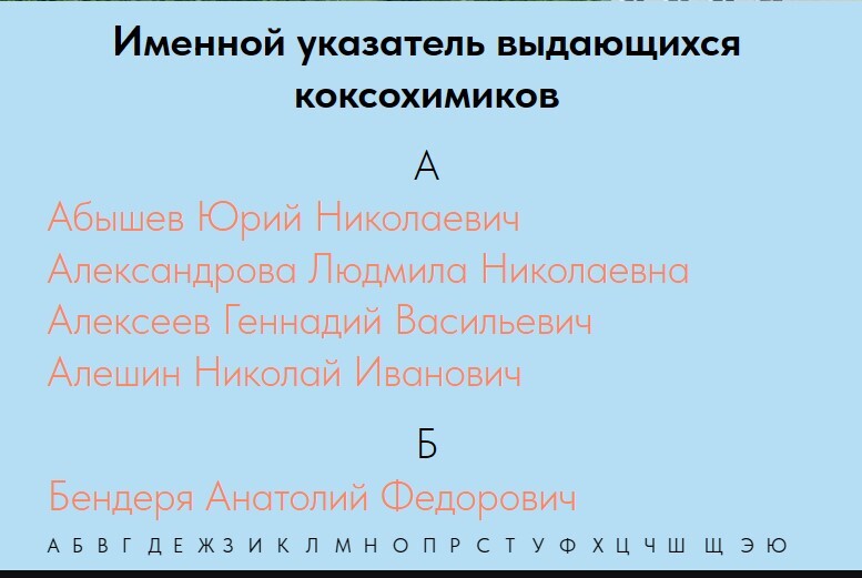 Экранная форма страницы «Именной указатель выдающихся коксохимиков»